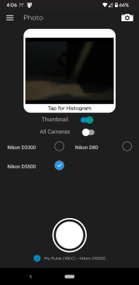 Take photos, adjust shutter speed, aperture and ISO from up to 100 feet away. Review low resolution thumbnails of the last photo you took alongside histogram data.